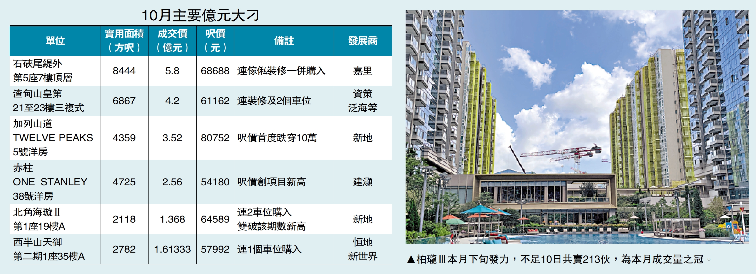 至於成交量最多的億元大刁,則為恒地夥新世界(00017)合資的西半山天御項目,兩期於月內共售出11伙,其中10伙作價均過億,套現12.2億元。