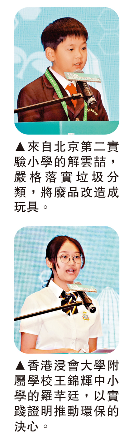 香港浸會大學附屬學校王錦輝中小學的羅芊廷,曾透過環保大使計劃參與海灘清潔,在短短2小時內,便與同學們拾起總共約47公斤的塑膠垃圾,深信「每一雙青年的手,都能撫平地球的傷痕」。她在學校發起利是封回收計劃,跟隨學校前往日本大阪參觀回收工廠,親手設計環保裝置,以實踐證明推動環保的決心。\大公報記者 易曉彤