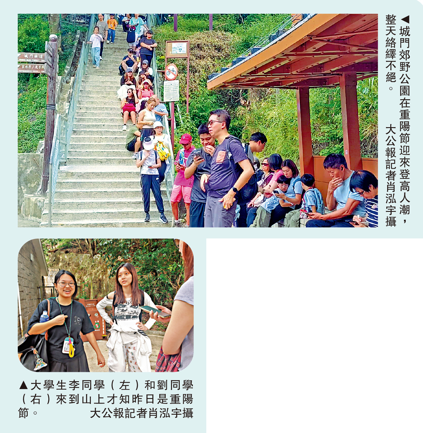 大學生李同學和劉同學也來到郊野公園,二人面有尷尬地告訴記者,「誤打誤撞」在重陽節登高。二人早已計劃這天來行山,早上出門時,看到不少店舖有香燭貢品,又見到很多人來登高,才醒覺這天是重陽節。