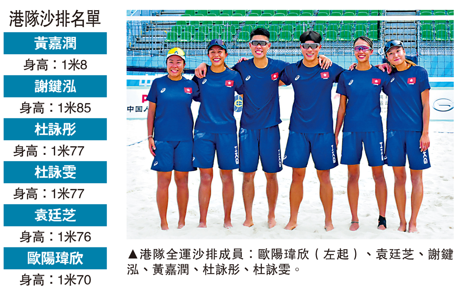 圖:港隊全運沙排成員:歐陽瑋欣(左起)、袁廷芝、謝鍵泓、黃嘉潤、杜詠彤、杜詠雯。