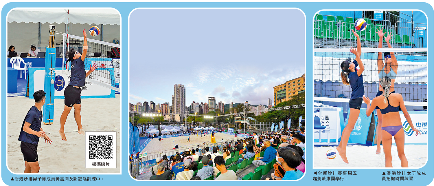 第15屆全運會香港賽區沙灘排球賽事31日起至11月10日在維多利亞公園開打,是香港主辦8個競賽項目「打頭陣」的賽事。中國香港沙排隊派出兩支女子隊及一支男子隊共6人參賽,他們希望把握主場優勢,以瞄準小組出線晉身8強為目標。\大公報記者 梁潤森