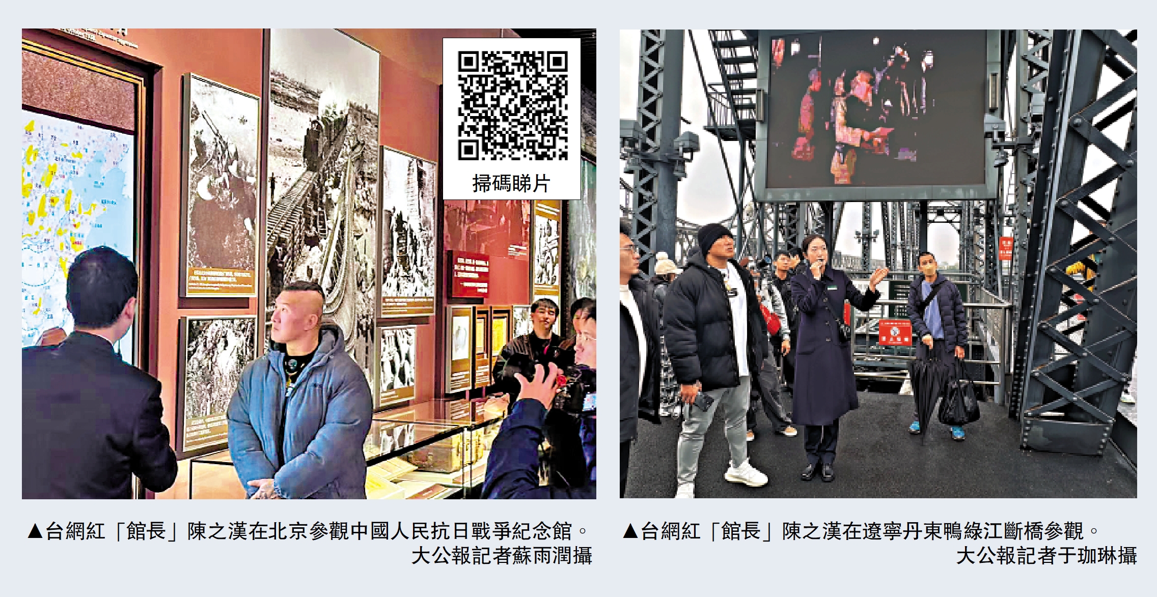 「館長」選擇在台灣光復紀念日當天開啟此次大陸行。從北京的抗日戰爭紀念館,到遼寧丹東的抗美援朝紀念館、抗美援朝出征地鴨綠江斷橋,他表示,此行以歷史文化為主線,要讓台灣年輕人看到當年兩岸同胞並肩作戰、保家衛國的歷史。