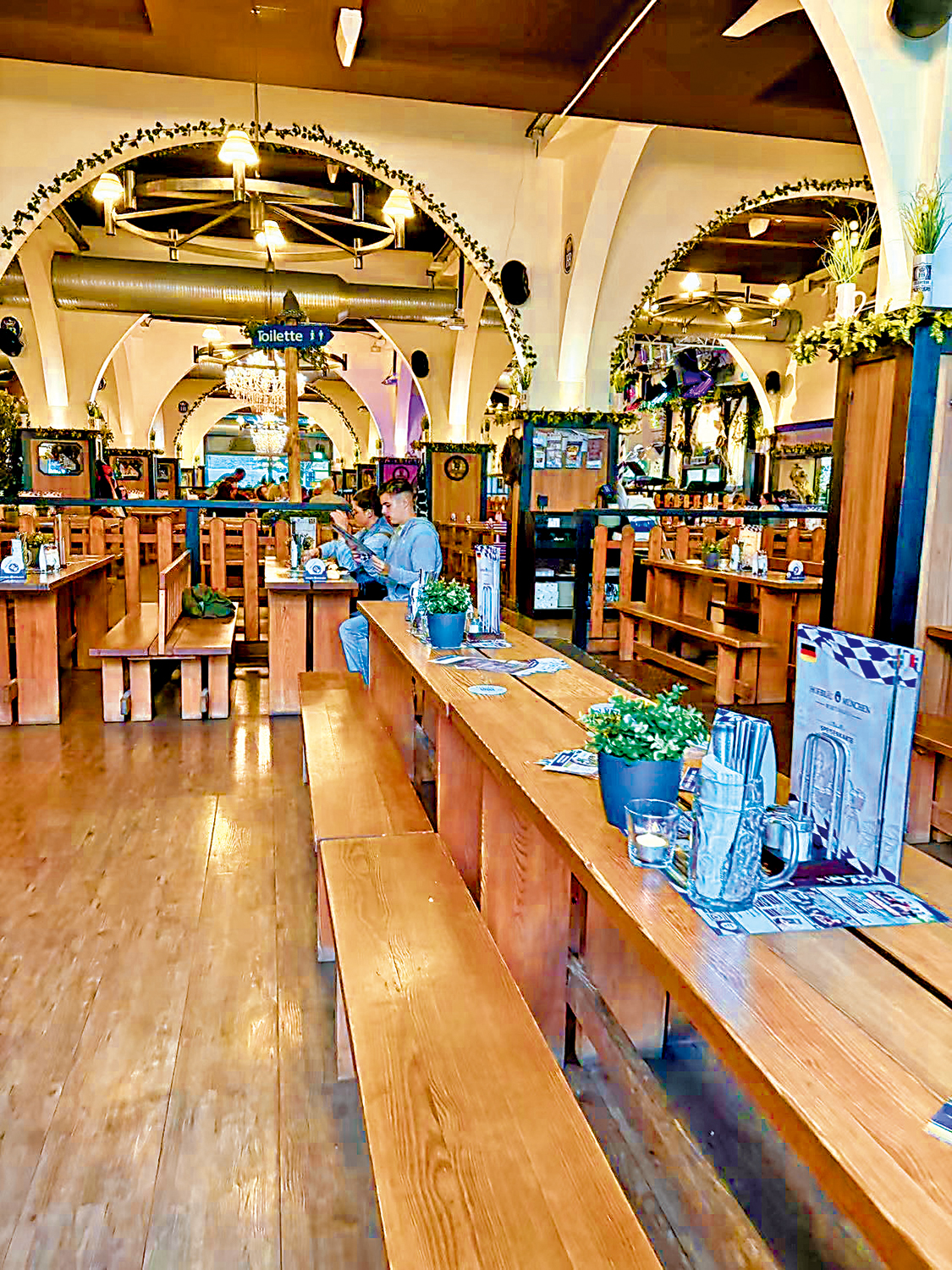 柏林店雖然於二○一一年才正式開業,但它幾乎完整還原了慕尼黑本店的裝修、餐品和氛圍──從長桌、大廳到整個木質花園裝修;從傳統巴伐利亞拉格啤酒、白啤,到巴伐利亞名菜烤豬肘、白腸;從現場傳統音樂樂隊,到服務員的傳統服飾……無一不讓人有了身臨其境的巴伐利亞體驗。