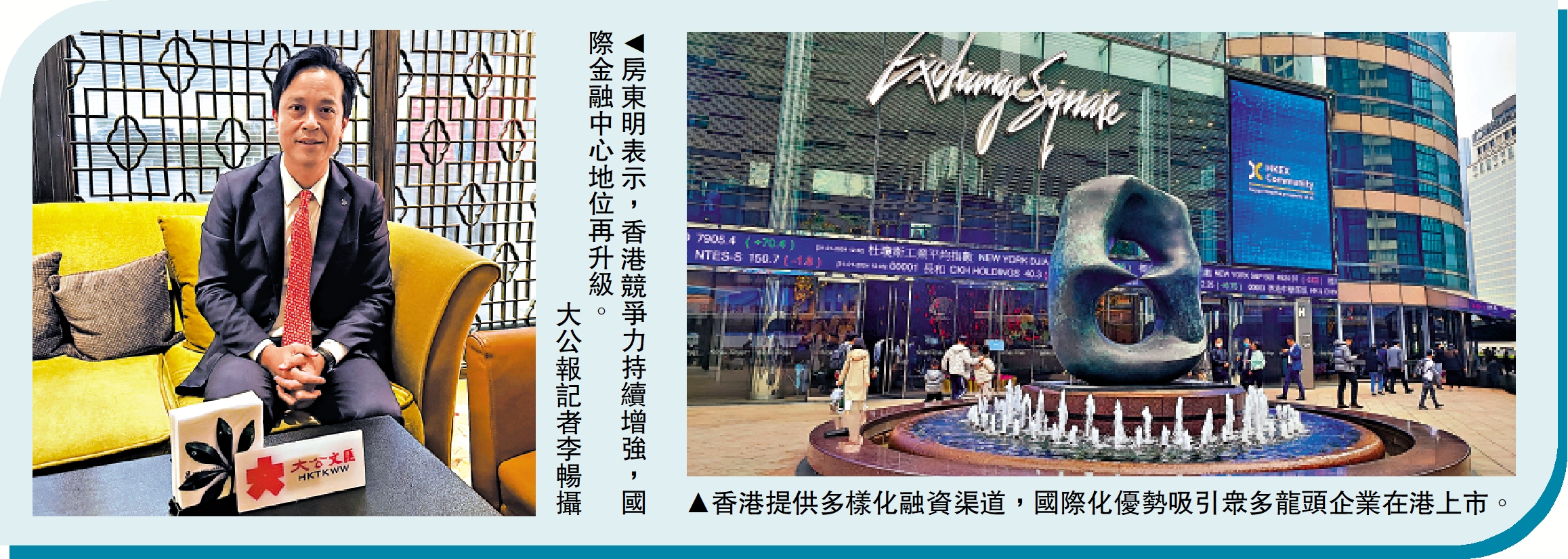他提到,香港作為國際化上市平台,提供多樣化融資渠道,順應新經濟發展需求,吸引眾多龍頭企業。房東明強調,香港是一個重要的出海配合點,內地企業在港上市,其品牌效應和估值從以往的折價變為如今的溢價,對公司具有強大吸引力。