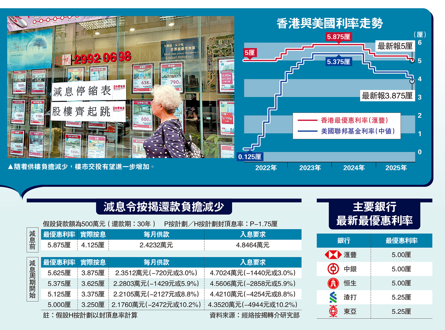 美聯儲宣布減息0.25厘,本港主要銀行滙豐、中銀等亦相繼下調最優惠利率(P)0.125厘,滙豐最新息率降至5厘,渣打則為5.25厘,紅簿仔存息重回至0.001厘。業界均認為,本港最優惠利率已減無可減,理論上減息周期已經結束,但按息仍有機會回落,未來視乎港元拆息回落速度。若年內及明年美國進一步減息,美息下跌將逐步推低港元拆息水平,預期明年按息或可進一步下跌。\大公報記者 邵淑芬