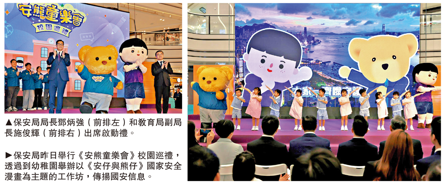 【大公報訊】記者古倬勳報道:保安局昨日舉行《安熊童樂會》校園巡禮,到幼稚園舉辦以國家安全漫畫為主題的工作坊,向幼兒傳揚國家安全信息,以期培育他們成為愛國愛港、守法為民的良好公民。