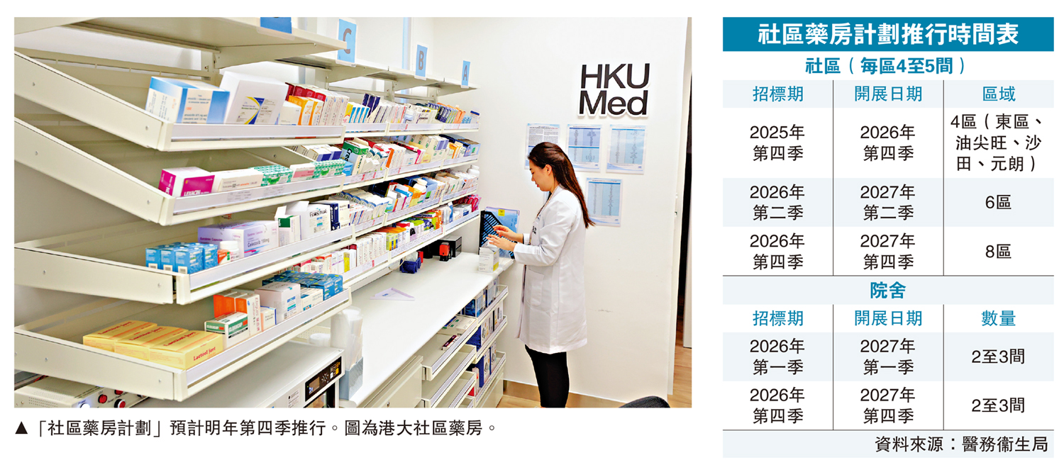 基層醫療署並推出《基層醫療社區藥房指引》,為社區藥房及其藥劑師服務準則建立清晰框架。指引作為社區藥房計劃的標準基礎,涵蓋社區藥房四大範疇,分別為運作及管理人員標準、處所要求、日常運作程序和服務範疇。首階段社區藥房計劃(社區)將於本季度進行招標,並於明年第四季起分階段推行。投標者必須是註冊藥房,在人手、儲存環境、工作流程、電腦系統等方面須符合標準。