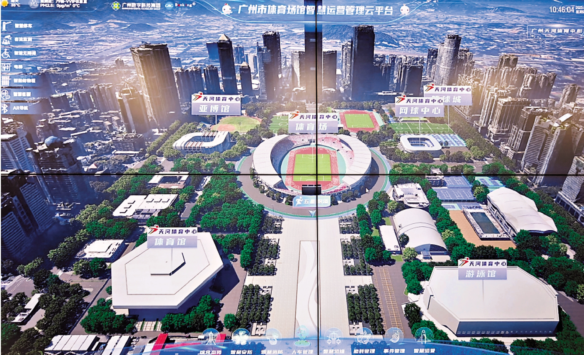 清晨時分,廣州天河體育中心外場早已熱鬧起來,一大批運動愛好者迎着朝陽慢跑、競走、起舞。而一牆之隔的天河體育中心體育場,已完成維修改造,工作人員正緊鑼密鼓搭建殘特奧會開幕式場地,一派熱火朝天的籌備景象。這兩處場景的實時動態,都被智慧場館運營管理雲平台通過三維孿生技術1:1精準還原,呈現在天河體育中心運營指揮中心的大屏幕上。