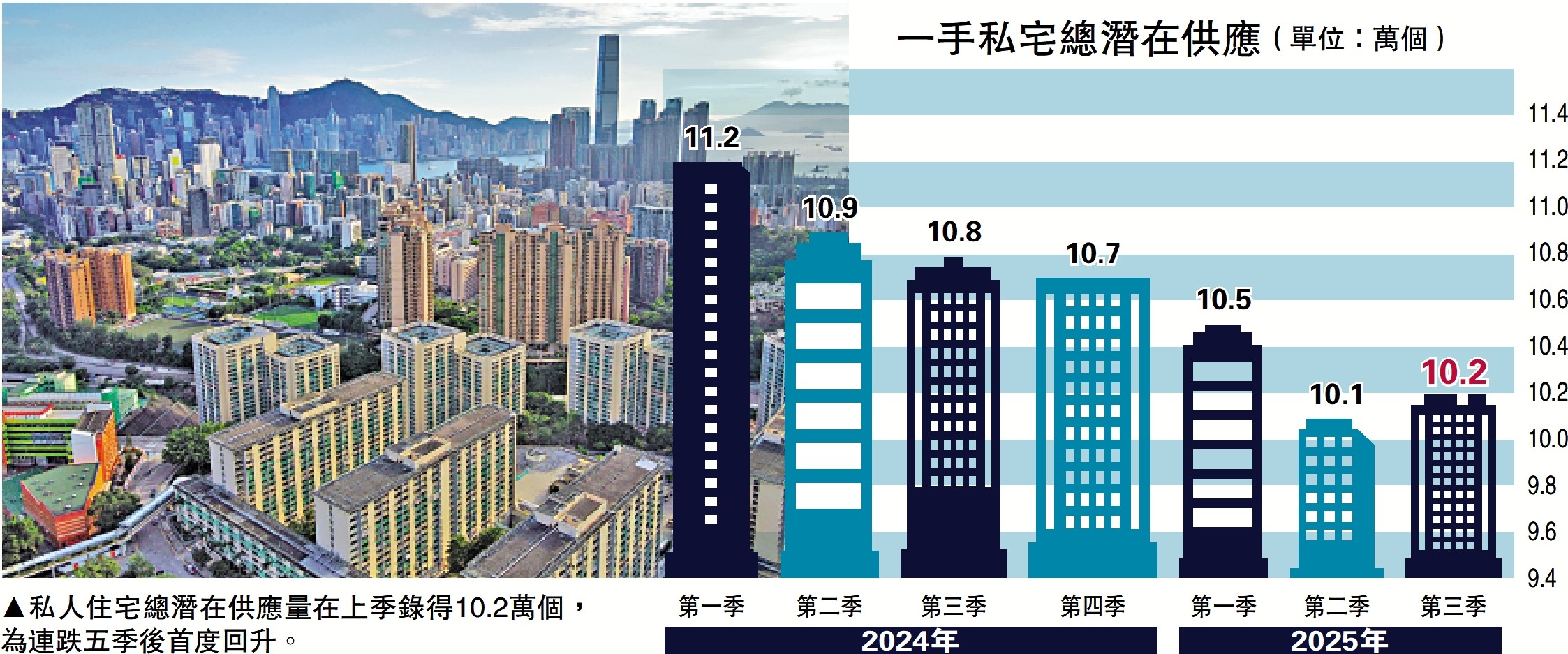 由於部分發展商開始對後市回復信心,趁目前地價偏低時與特區政府達成多個私人項目的換地補地價協議,故特區政府批出未動工的單位量按季回升4000個至1.4萬個,為六個季度新高,故此,令私樓總潛在供應量在回落5個季度後,上季反彈1000個至10.2萬個。