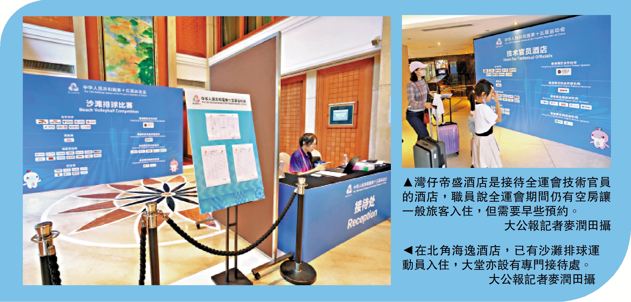 在北角海逸酒店,大公報記者現場所見,沙灘排球運動員已經入住,酒店大堂內設有全運會相關人員接待處、運動員餐廳指示,以及售賣全運會商品的攤位。在位於旺角的康德思酒店,全運會工作人員昨日陸續入住。職員表示,全運會期間除接待代表團成員外,目前仍有不同類型酒店房間可供預定,最便宜的約2000元一晚。