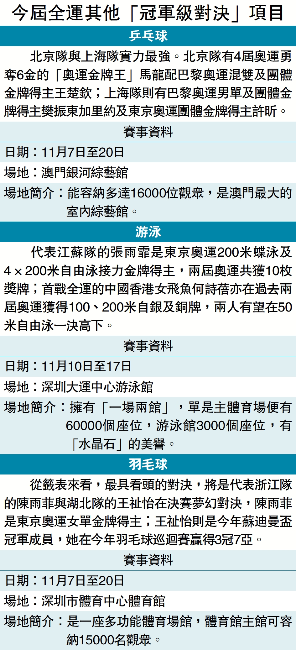 代表江蘇隊的張雨霏是東京奧運200米蝶泳及4×200米自由泳接力金牌得主,兩屆奧運共獲10枚獎牌;首戰全運的中國香港女飛魚何詩蓓亦在過去兩屆奧運獲得100、200米自銀及銅牌,兩人有望在50米自由泳一決高下。