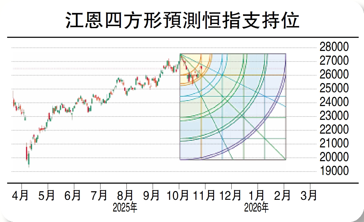 其實,自10月2日以來的調整已反映出江恩四方形的計算十分準確,例如在10月17日恒指曾跌至低見25145.34點,若用江恩四方形去計算,2520度代表25114.2點,與當日低位只相差30點左右。