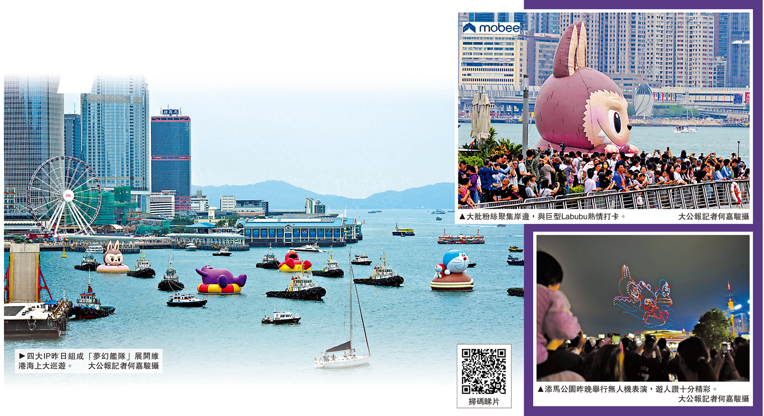 Labubu、多啦A夢等四大IP的巨型充氣雕塑,昨日在金鐘添馬公園對開海面展出最後一日,並進行海上大巡遊,在維港繞圈兩次,途經北角及尖沙咀,全程約三小時。大公報記者在維港兩岸現場直擊,見到大量人潮在海旁圍觀打卡,不時有Labubu粉絲興奮呼喚其名字。傍晚在金鐘添馬公園上空,由無人機表演展示四大IP及黃色橡皮鴨,與駐足的遊客道別,現場人山人海。