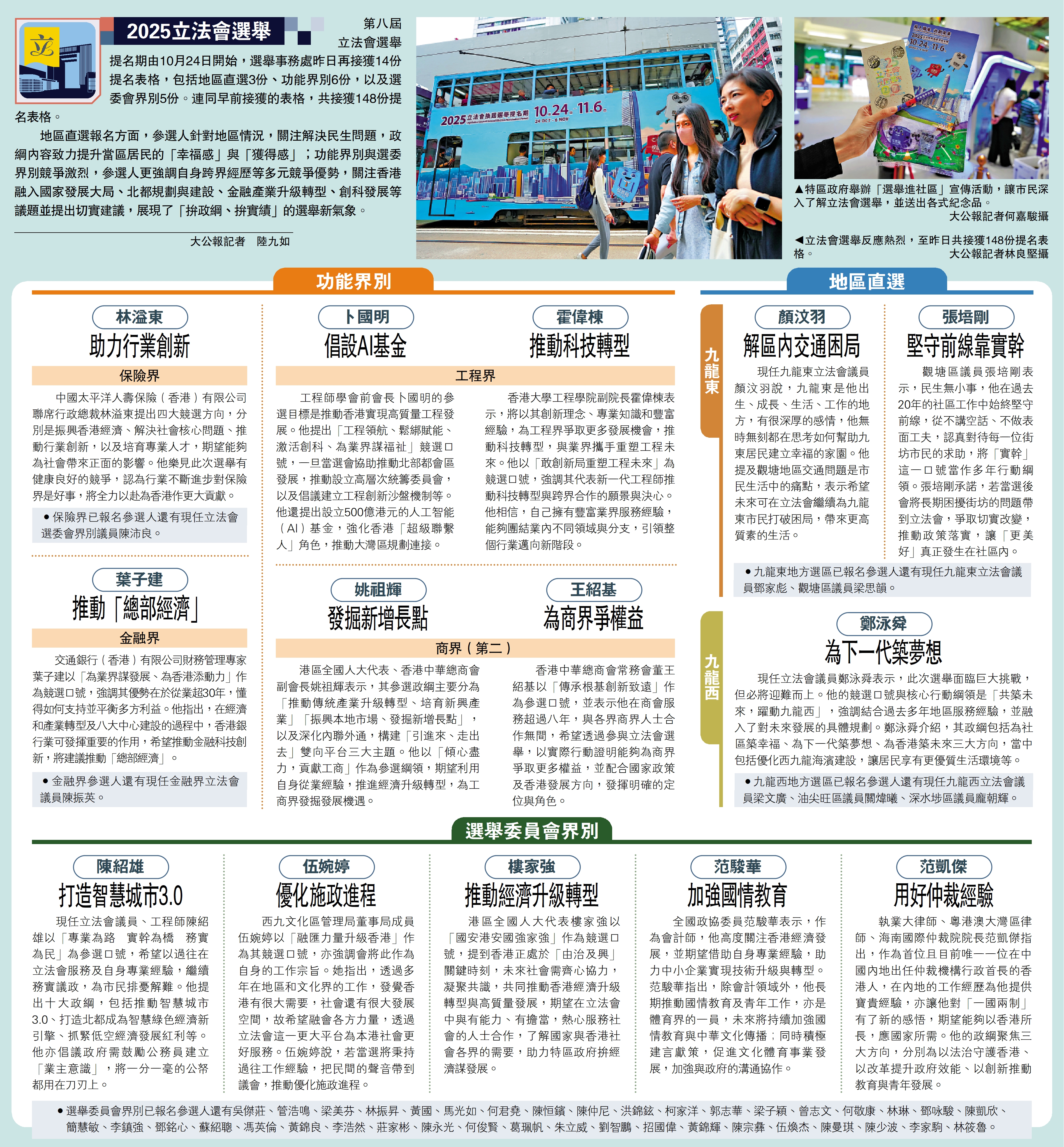 地區直選報名方面,參選人針對地區情況,關注解決民生問題,政綱內容致力提升當區居民的「幸福感」與「獲得感」;功能界別與選委界別競爭激烈,參選人更強調自身跨界經歷等多元競爭優勢,關注香港融入國家發展大局、北都規劃與建設、金融產業升級轉型、創科發展等議題並提出切實建議,展現了「拚政綱、拚實績」的選舉新氣象。\大公報記者 陸九如