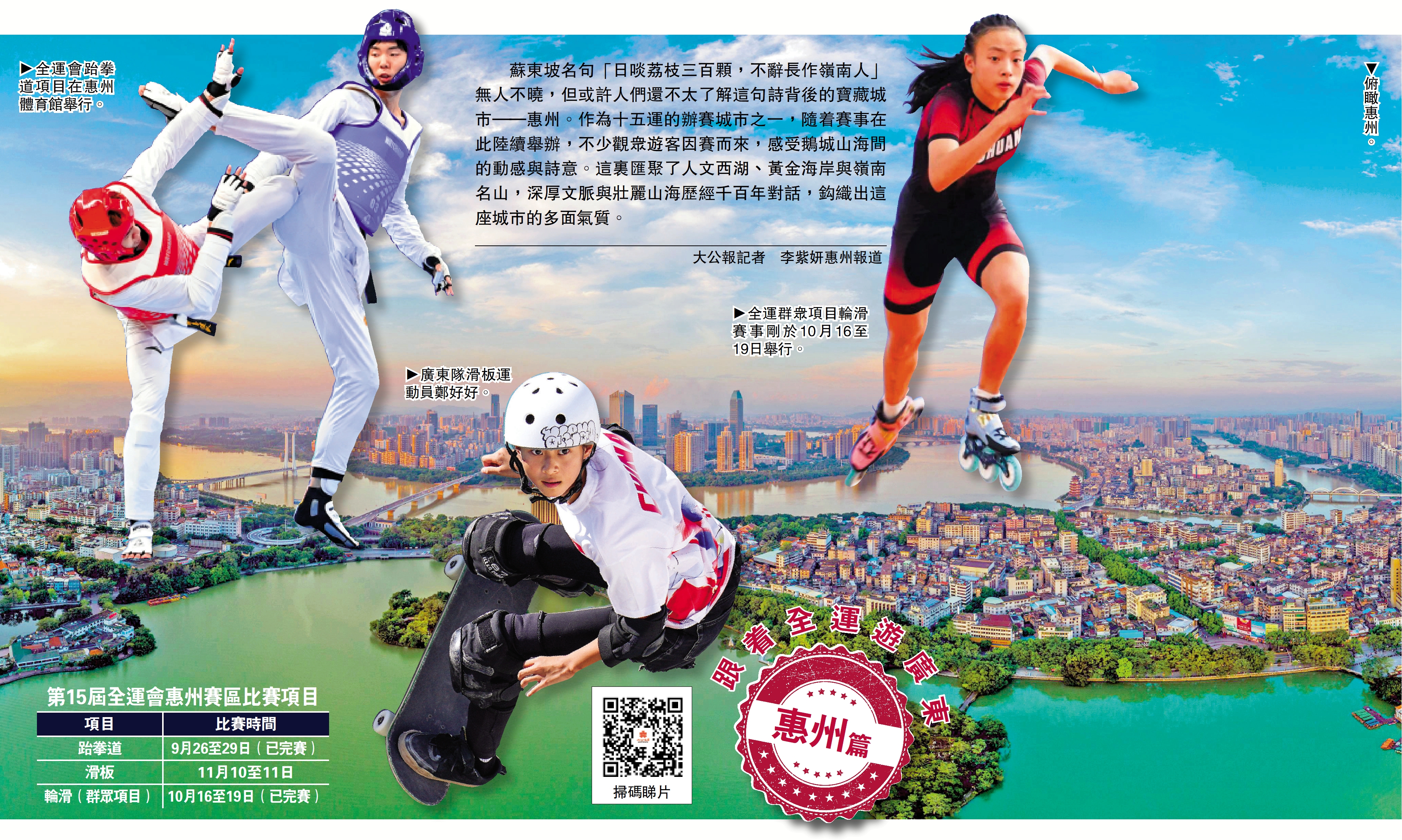 蘇東坡名句「日啖荔枝三百顆,不辭長作嶺南人」無人不曉,但或許人們還不太了解這句詩背後的寶藏城市——惠州。作為十五運的辦賽城市之一,隨着賽事在此陸續舉辦,不少觀眾遊客因賽而來,感受鵝城山海間的動感與詩意。這裏匯聚了人文西湖、黃金海岸與嶺南名山,深厚文脈與壯麗山海歷經千百年對話,鈎織出這座城市的多面氣質。/大公報記者 李紫妍惠州報道