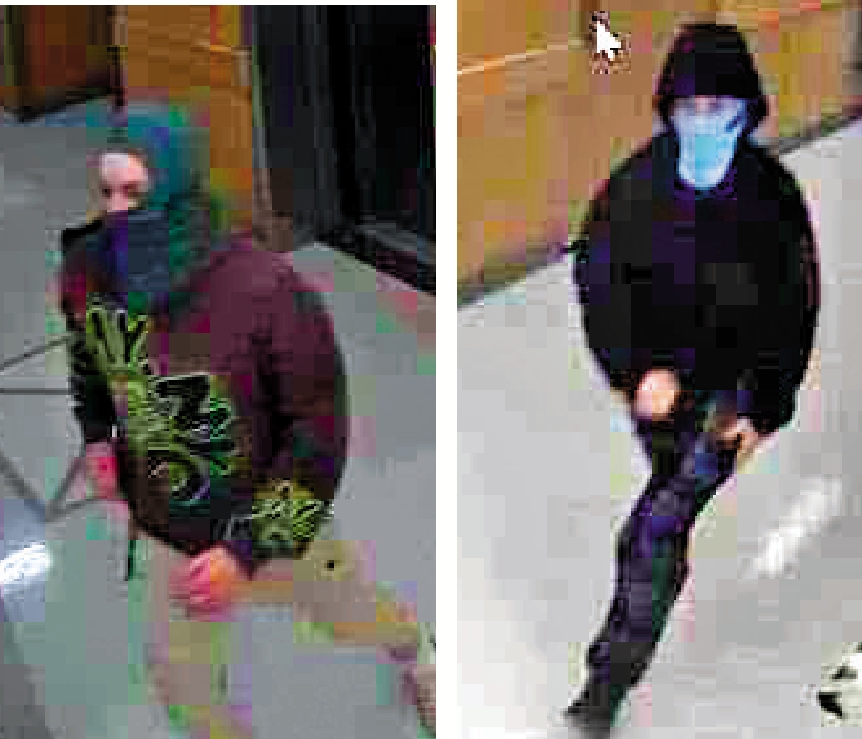 警方公布嫌疑人監控錄像畫面,其中一人戴着灰色滑雪面罩,身着棕色連帽衫,上面印有醒目的黑黃兩色大號文字;另一人蒙着長款面罩、身着黑色連帽衫。當局呼籲公眾協助辨識其身份。