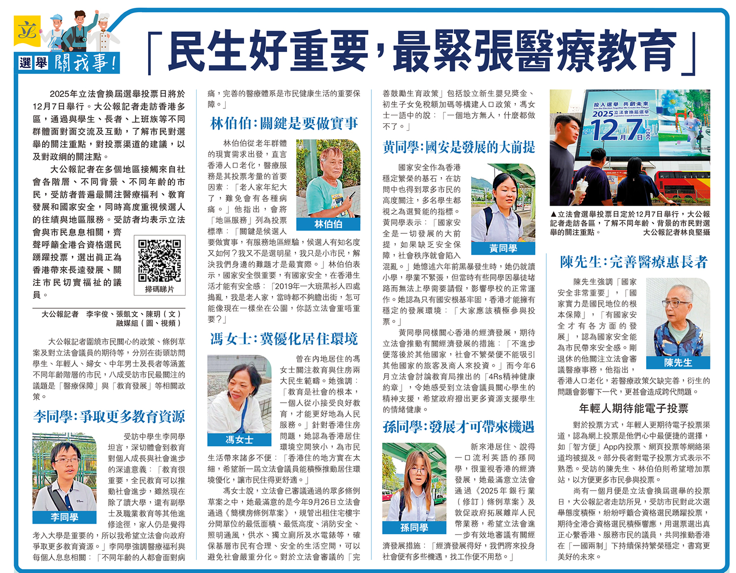 大公報記者在多個地區接觸來自社會各階層、不同背景、不同年齡的市民,受訪者普遍最關注醫療福利、教育發展和國家安全,同時高度重視候選人的往績與地區服務。受訪者均表示立法會與市民息息相關,齊聲呼籲全港合資格選民踴躍投票,選出真正為香港帶來長遠發展、關注市民切實福祉的議員。\大公報記者 李宇俊、張凱文、陳玥(文) 融媒組(圖、視頻)