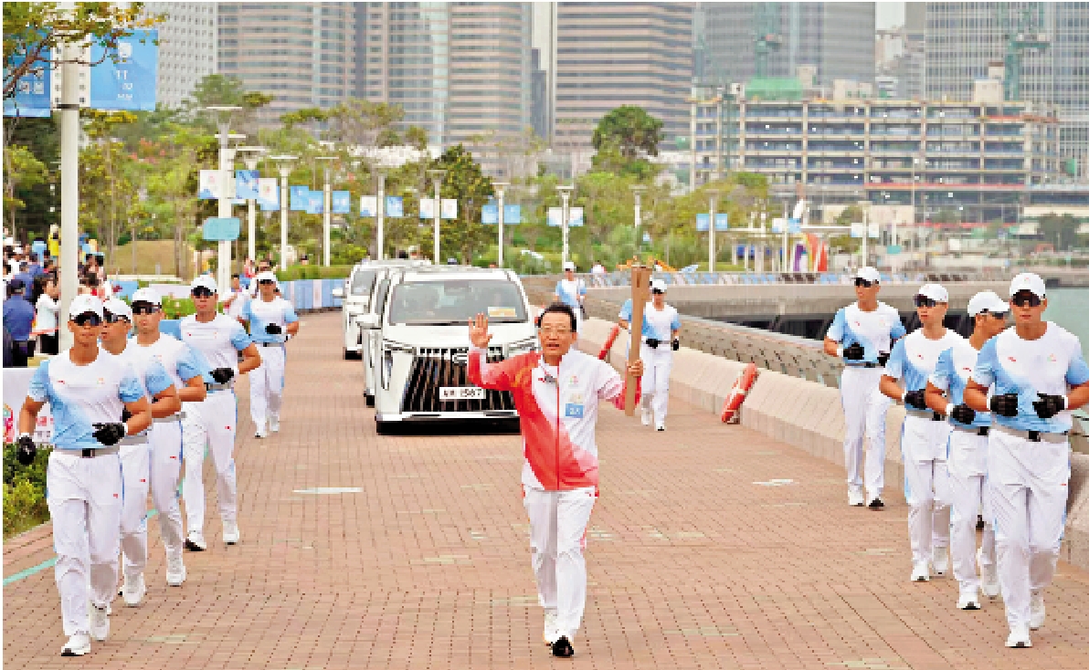 【大公報訊】香港賽區全運會火炬傳遞昨日(2日)舉行。由50位火炬手組成的接力隊昨早從政府總部出發,橫跨維多利亞港,最終抵達啟德體育園中央廣場並舉行了收火儀式。廣汽集團早前向香港賽區賽事提供270台指定用車,其中廣汽智電新能源MPV傳祺E9 PHEV昨日亮相火炬傳遞活動,廣汽集團董事長馮興亞更擔任第8棒火炬手。