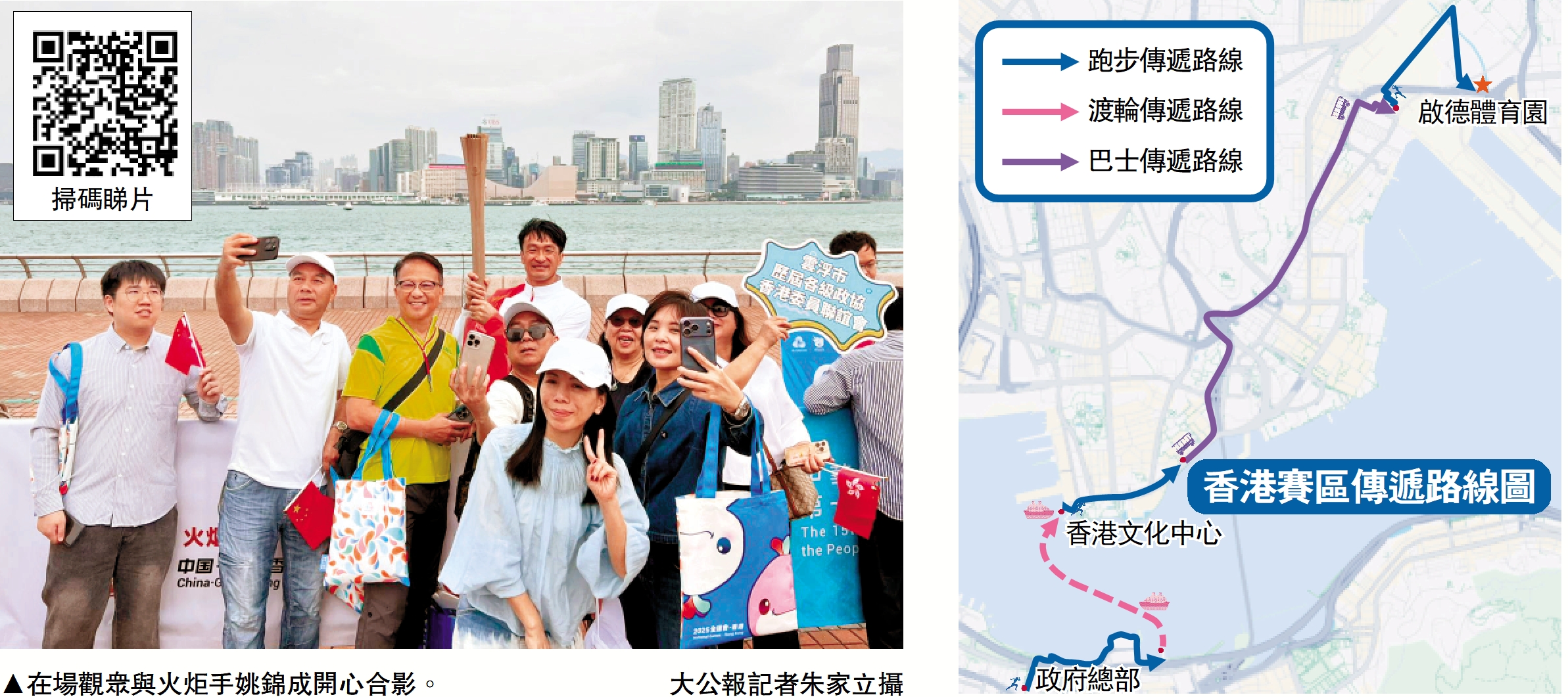 昨日早上9時多,火炬傳遞還未開跑,大公報記者在尖沙咀天星碼頭一帶現場直擊,見到火炬傳遞路線圍欄前的位置已經人頭湧湧,不少市民和旅客已將手機、相機準備就緒。有人背着印有全運會吉祥物的帆布袋,也有人準備好印有「香港」字樣的橫幅,揮動着區旗、國旗,和親友討論火炬交接時間,亦有外國遊客被吸引駐足。