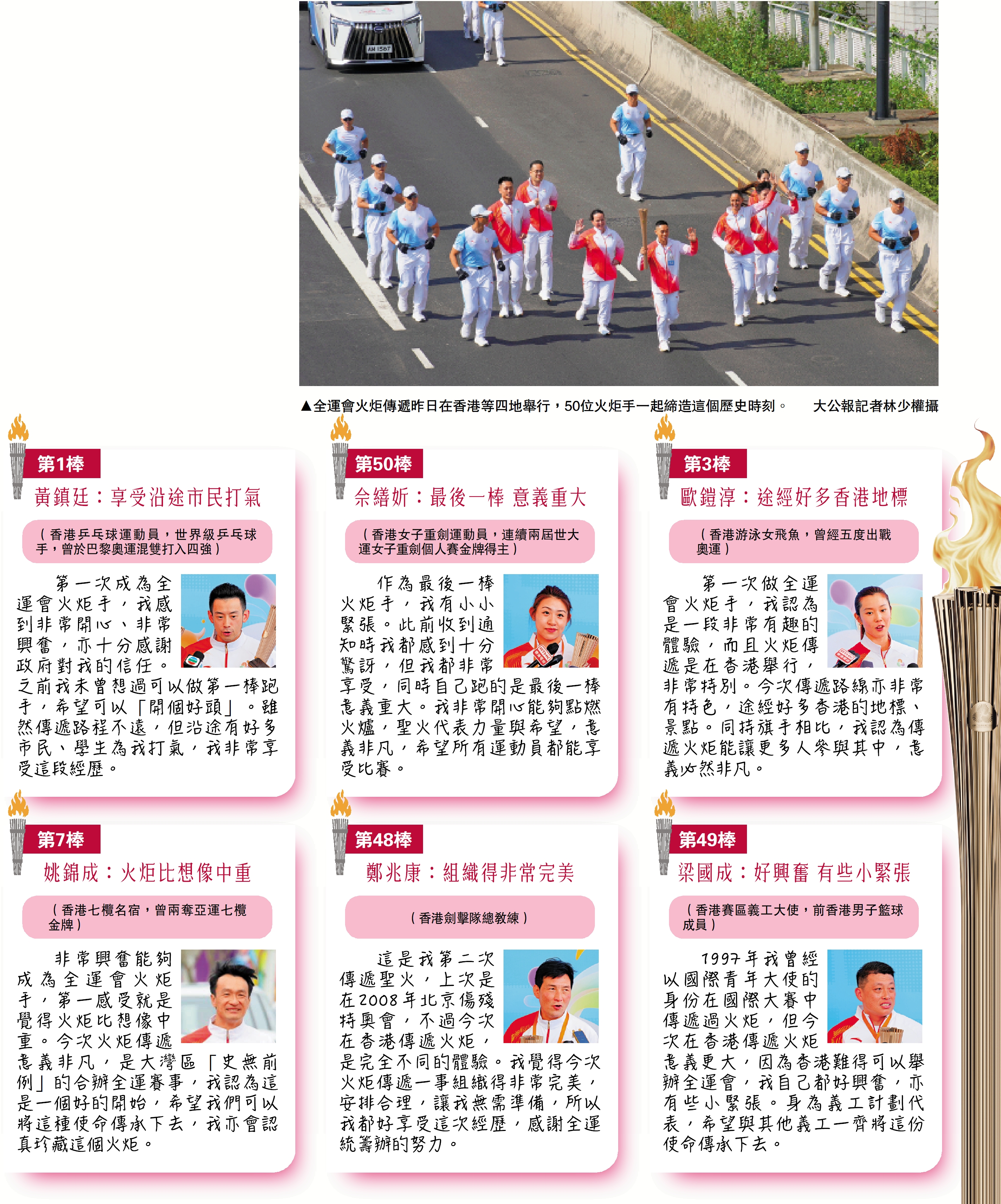 其中,作為首棒火炬手的中國香港乒乓球名將黃鎮廷表示,對擔任首棒火炬手感到興奮,希望可以為大家「開個好頭」。至於最後一棒的女重劍手佘繕妡,她認為末棒意義重大,聖火代表力量與希望,希望所有參賽運動員能享受比賽、圓夢全運。\大公報記者 朱家立