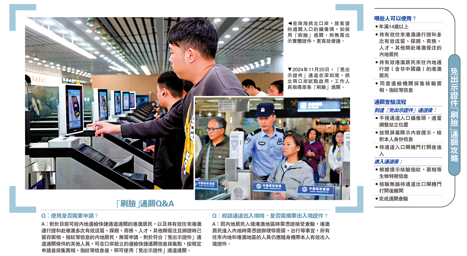 年滿14周歲以上,持有效往來港澳通行證和多次有效逗留、探親、商務、人才、其他類赴港澳簽注的內地居民,以及持有效港澳居民來往內地通行證(含非中國籍)的港澳居民、持5年有效台灣居民來往大陸通行證的台灣居民,且同意採集核驗面相、指紋等信息用於出入境邊防檢查核驗的,可選擇使用上述口岸出入境邊防檢查現場智能快捷通道「刷臉」通行。限制或無民事行為能力人,經智能快捷通道出境入境時應有法定監護人陪同。
