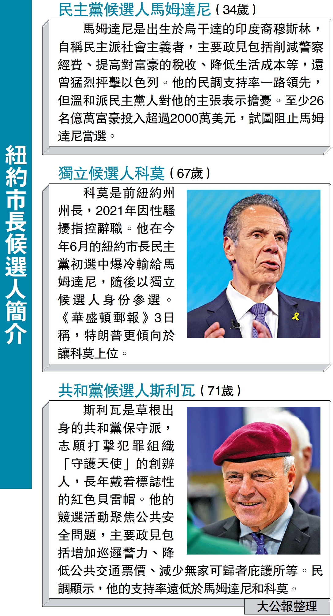 馬姆達尼是出生於烏干達的印度裔穆斯林,自稱民主派社會主義者,主要政見包括削減警察經費、提高對富豪的稅收、降低生活成本等,還曾猛烈抨擊以色列。他的民調支持率一路領先,但溫和派民主黨人對他的主張表示擔憂。至少26名億萬富豪投入超過2000萬美元,試圖阻止馬姆達尼當選。