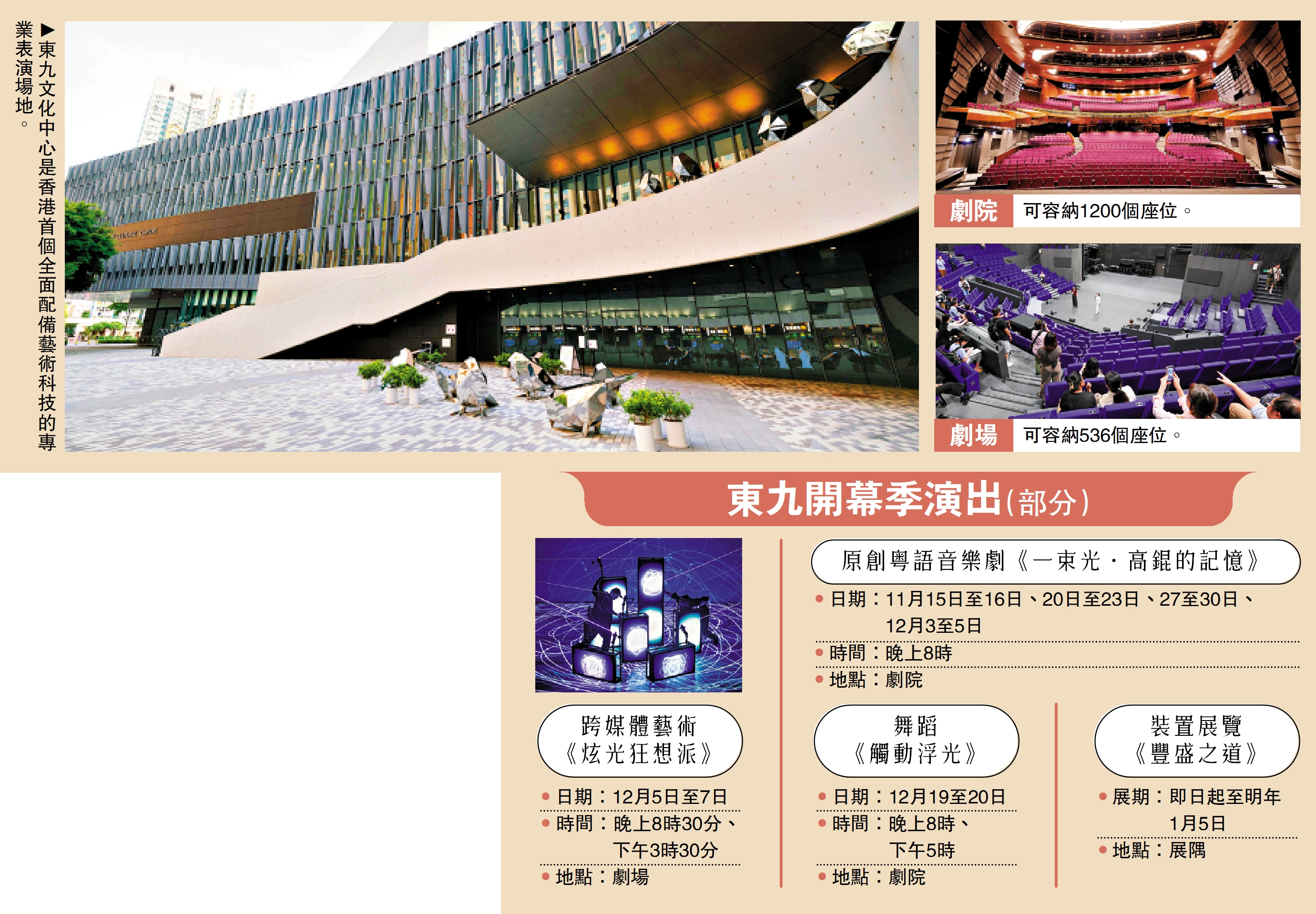 香港東九文化中心本月正式投入使用,昨日舉行揭幕典禮。作為香港首個全面配備藝術科技的專業表演場地,特別將其劇院預留作長期演出用途,令標誌性的製作得以長時間演出,推動演藝產業持續發展。11月15日將在劇院上演開幕節目《一束光·高錕的記憶》,之後是為期3個月的「開幕季」,將呈現17個本地及國際的演出節目,亦有藝術科技節目包括無人機舞蹈、光雕投影等。第15屆全國運動會舉行期間,東九文化中心也會直播開幕儀式及焦點賽事。\大公報記者 劉 毅