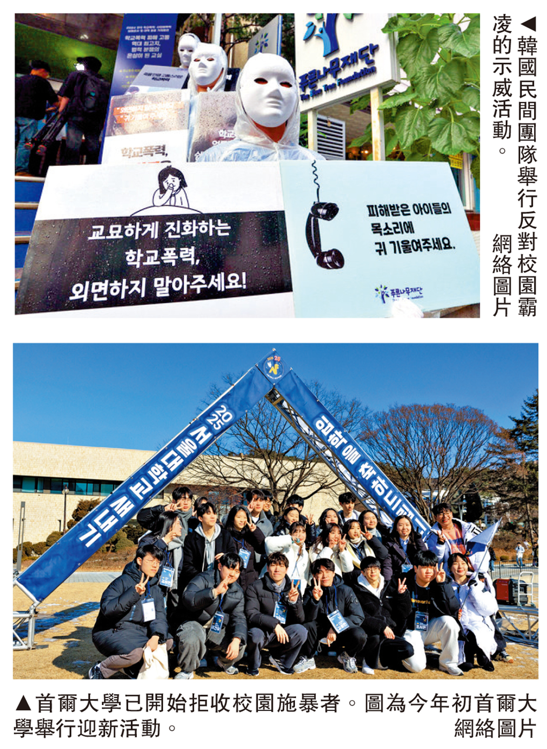 •今年招生季,首爾大學和慶北大學等6所韓國名校已開始拒收有校園暴力紀錄的申請者,總共45人被拒收。京仁教育大學等10所師範院校已宣布,自明年起,有校園暴力紀錄的申請者,無論情節輕重,都將被直接取消錄取資格。其他師範院校及醫科院校也在考慮實施類似舉措。