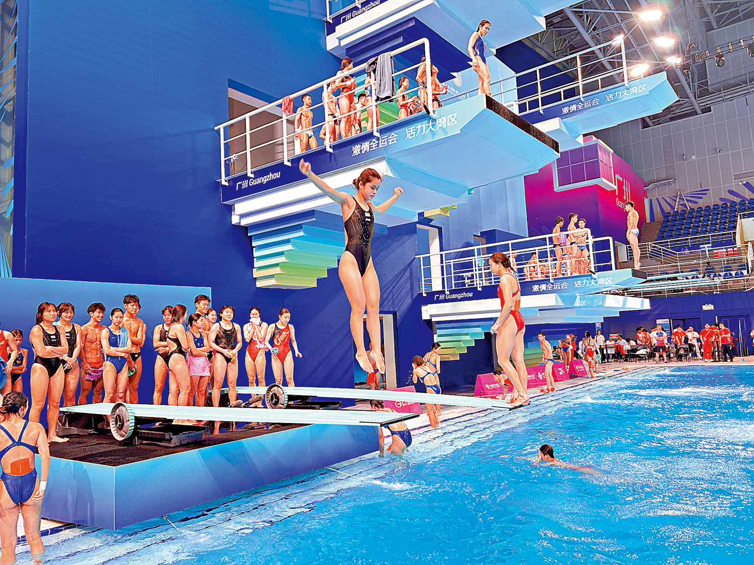 3日下午,港隊抵達廣州,不久後即從酒店趕赴廣東奧體中心體育館,全體運動員到場觀賽。當晚,謝思埸、陳艾森、王宗源等多名奧運冠軍登場,中國香港游泳總會主席、香港跳水隊領隊鄧永康說,全運會是頂級舞台,特別是跳水項目,競爭激烈程度和精彩程度甚至超過奧運會,對初登全運舞台的港隊來說,是觀摩學習良機。當晚沒有比賽任務的廣東跳水隊教練也出現在運動員觀賽區,粵港兩地選手坐在同一區域,不時互相交流,分析不同選手的技術特點和表現。