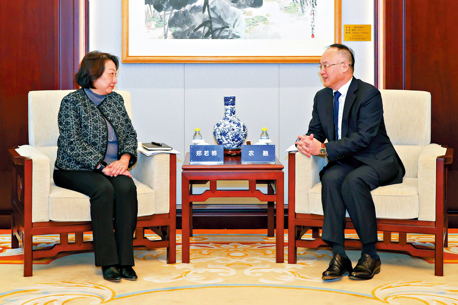 圖:農融在北京會見國際調解院秘書長鄭若驊一行。\國務院港澳事務辦公室圖片