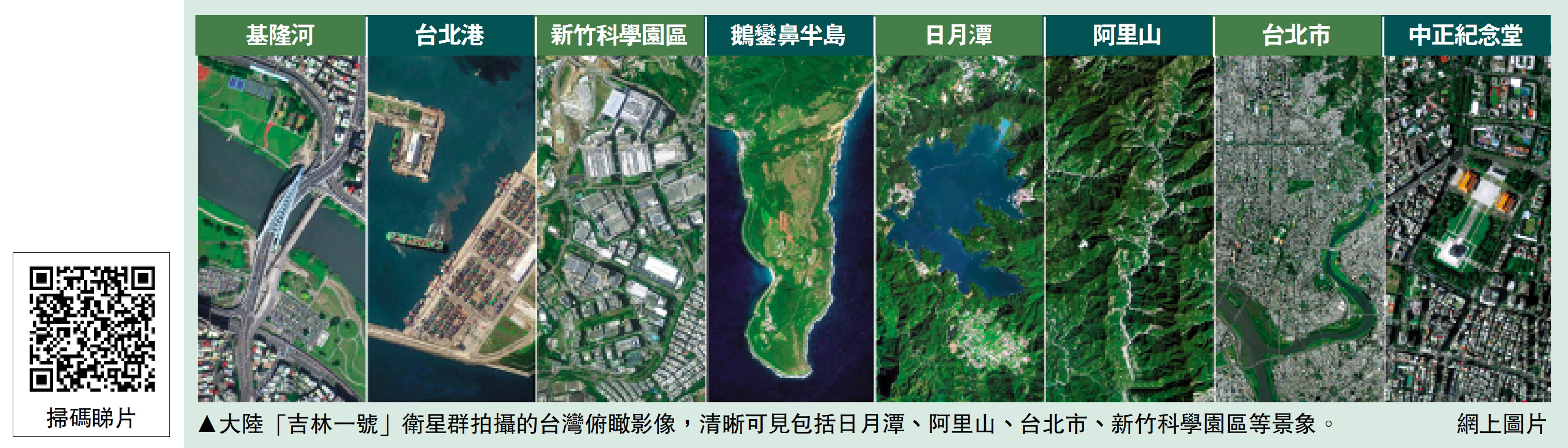 在上月第一個台灣光復紀念日之際,大陸商用衛星「吉林一號」公布了8張太空視角下涵蓋台灣各地的衛星影像圖片,不僅囊括日月潭、阿里山、鵝鑾鼻半島等著名觀光景點,還包括台北市、新竹科學園區等地景象。在衛星視角下,台灣每條街道清晰可見,引發輿論關注。