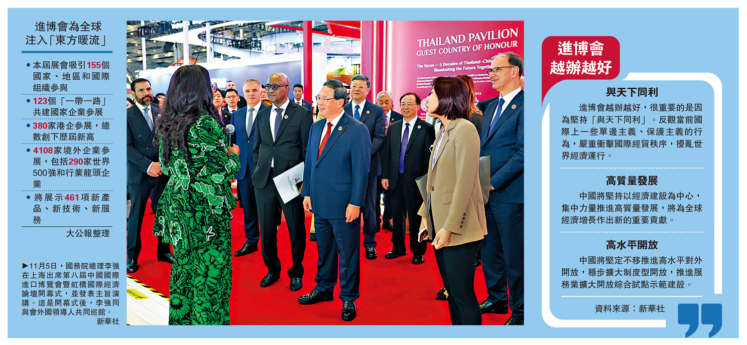 以「開放」為底色、以「合作」為旋律,進博會「東方之約」,成為全球經濟「確定性錨點」。國務院總理李強昨日在上海出席第八屆中國國際進口博覽會暨虹橋國際經濟論壇開幕式,並發表主旨演講。李強表示,今年進博會參展企業數量再創歷史新高,充分彰顯中國超大規模市場的蓬勃生機和活力。進博會越辦越好,重要原因是堅持「與天下同利」。