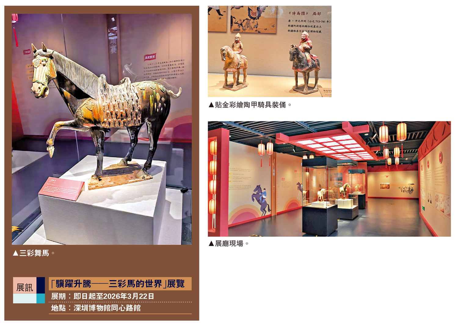 第十五屆全國運動會馬術項目賽事將於11月10日至19日在深圳市光明國際馬術中心及光明科學公園舉行。為了讓市民和遊客在觀賽之餘深度領略馬文化獨特魅力、感受馬術運動深厚的歷史底蘊,賽事期間,深圳博物館與陝西唐三彩藝術博物館合作推出「驥躍升騰──三彩馬的世界」展覽,來自陝西唐三彩藝術博物館收藏的彩繪陶馬球俑、三彩舞馬、三彩噬蹄馬、三彩鳳首壺等42組60件各類唐代文物珍品呈現了色彩斑斕、造型精妙的唐三彩藝術之美。\大公報記者 李望賢(文、圖)