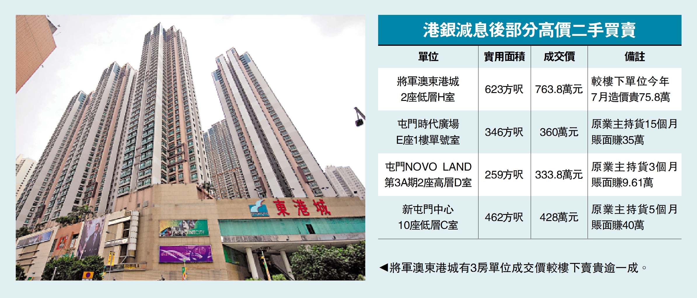 美聯物業區域營業董事劉卓豪表示,小業主趁減息略為收窄議價空間,加上平價筍盤普遍被消耗,令買家略為放緩入市,情況與9月份減息時相若。據成交資料,將軍澳踏入11月份暫錄26宗二手買賣,其中東港城2座低層H室3房單位,實用面積623方呎,成交價763.8萬元,實用呎價12260元,較樓下低一層H室於今年7月的造價688萬元,賣貴75.8萬元,升幅達11%。
