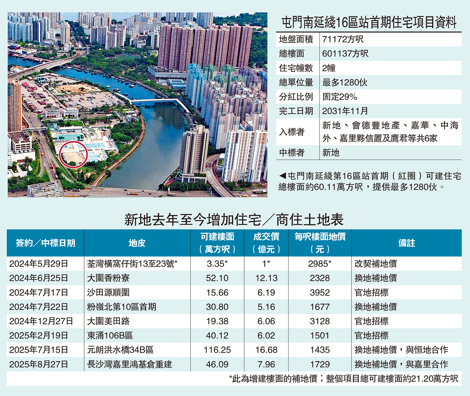 前日截標的屯門南延綫第16區站首期住宅項目,港鐵(00066)昨日旋即公布結果,上次棄投附近海珠路地皮的新地(00016),今次成功奪得項目合作發展權,並預計總投資約60億元,興建最多1280個中小型單位。新地是過去兩年最積極增加可發展土地儲備的發展商,透過官地招標及私人市場等,最少已得9個項目,提供約8000個單位。\大公報記者 林志光