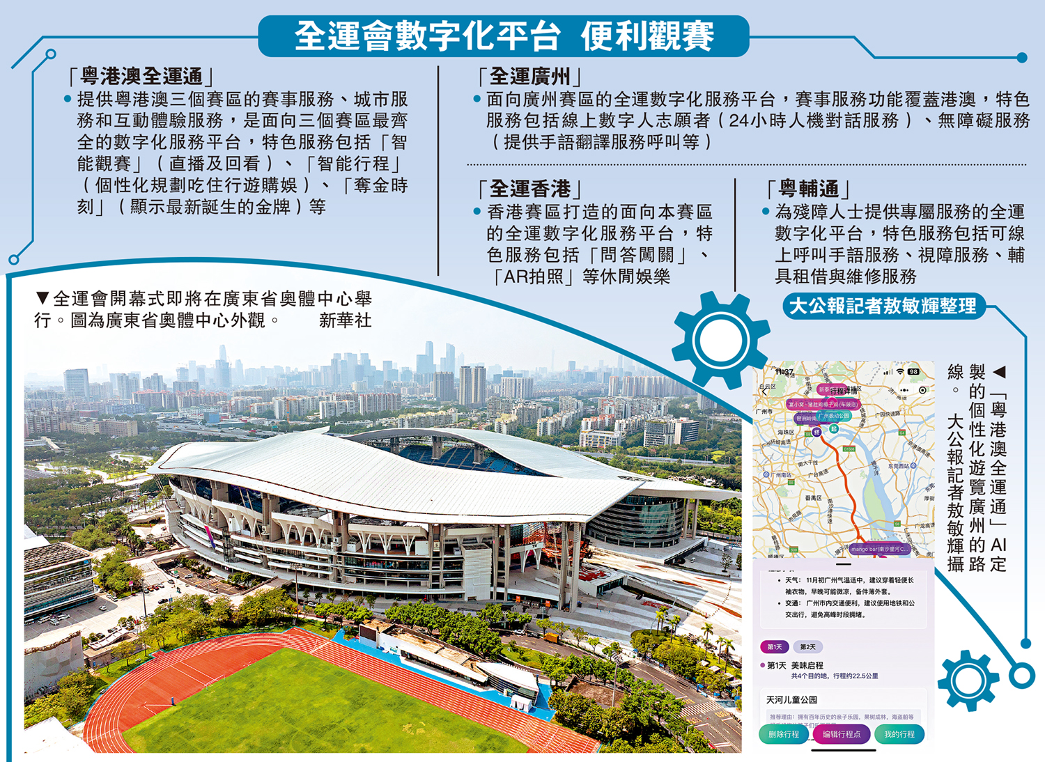 早前,面向粵港澳三賽區開發的數字化服務平台「粵港澳全運通」上線。這款集賽事服務、城市導覽、互動體驗於一體的數字化平台,打通了觀眾「看比賽」和「逛灣區」的雙重需求,服務覆蓋粵港澳三賽區吃住行遊購娛各環節,讓觀眾遊客沉浸式感受全運精彩與灣區魅力。值得一提的是,對於不熟悉內地的港人來說,該平台可AI一鍵規劃個性化行程,猶如一位「無所不知」的貼身地陪導遊,徹底解決了跨地域觀賽的不便。\大公報記者 敖敏輝