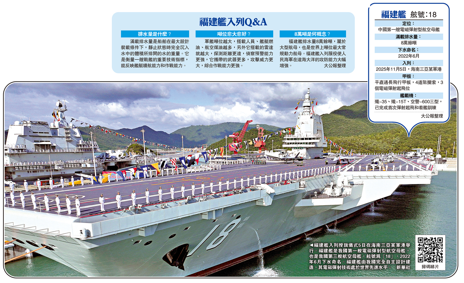 福建艦排水量8萬餘噸,屬於大型航母,也是世界上噸位最大常規動力航母。福建艦入列服役使人民海軍在遠海大洋的攻防能力大幅增強。