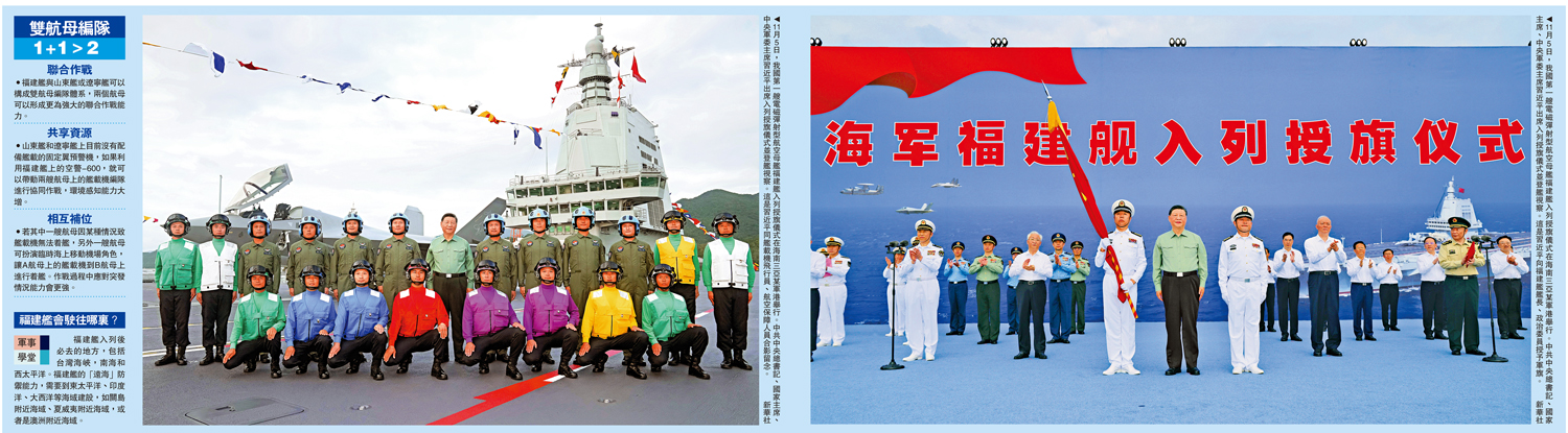 【大公報訊】據新華社報道:十一月的三亞,海闊天高,碧波浩瀚。軍港內,福建艦踏海而立、滿旗高懸,山東艦伏波相伴,來自海軍部隊和航母建設單位的代表2000餘人在碼頭整齊列隊,氣氛隆重熱烈。
