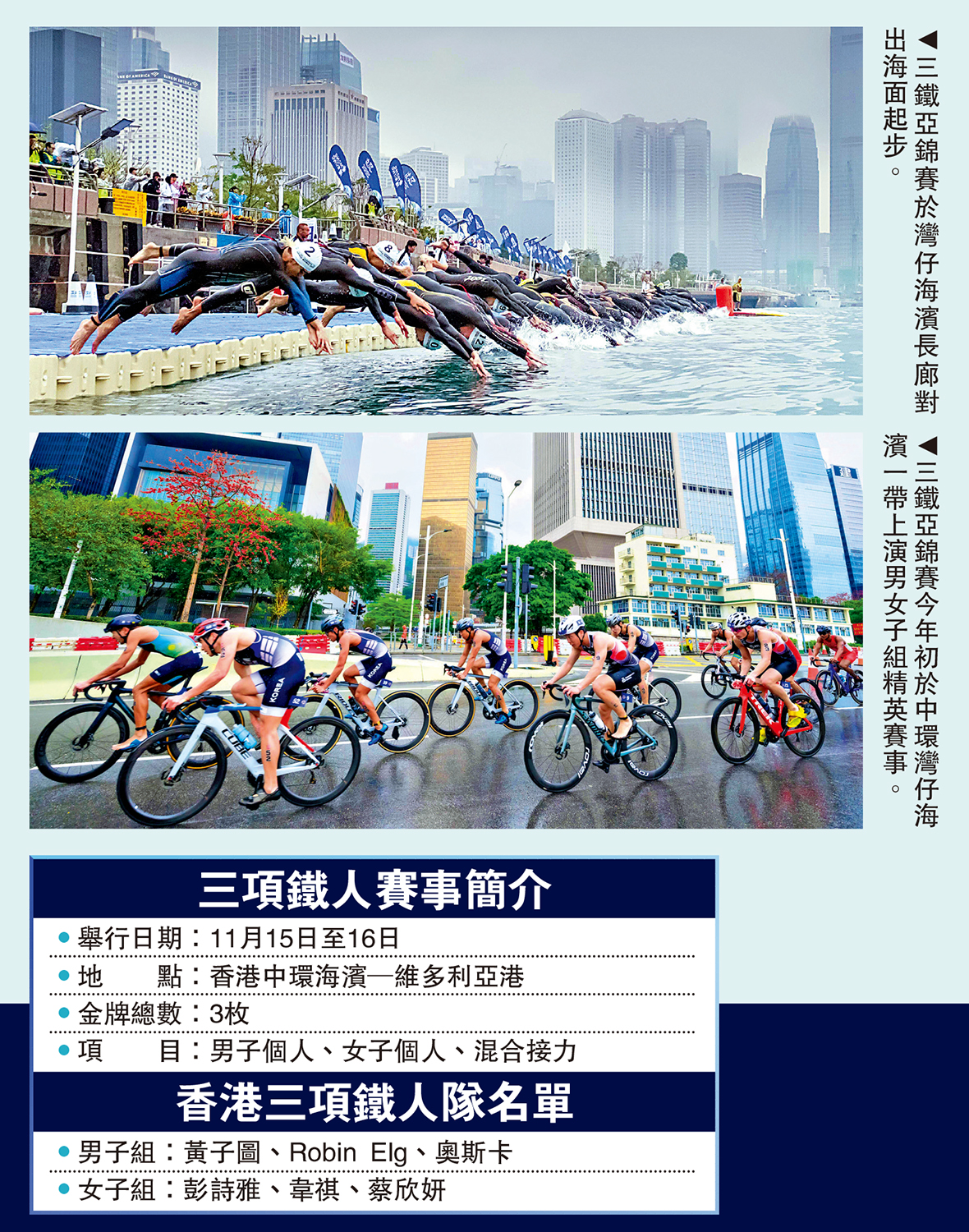 【大公報訊】記者梁潤森報道:第15屆全運會三項鐵人賽事將於11月15日至16日,在香港中環海濱活動空間舉行,香港賽區承辦全部項目,並將誕生3枚金牌。港隊派出3男3女選手出戰,陣容包括從法國轉籍而來的新星Robin Elg,歷經斷指意外後強勢回歸的「港隊一姐」彭詩雅,以及黃子圖、奧斯卡、韋祺與蔡欣妍。無論新秀或老將,皆展現鐵人堅毅意志,盼憑藉主場優勢奮力一搏,爭取站上頒獎台。