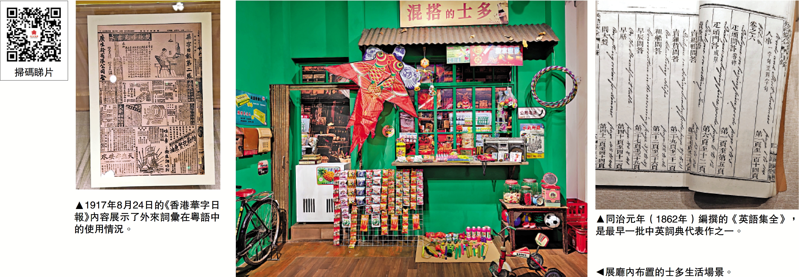 正在廣州博物館展出的「粵語·粵物——方言裏的生活密碼」,以「粵語」為主角,圍繞「着衫(穿衣)」「行街(出行)」「食飯(飲食)」「睇戲(娛樂)」「返屋企(歸家)」五大生活場景展開,通過那些或詼諧生動或言簡意賅的粵語表達,讓觀眾直觀感受「九聲六調」背後的歷史厚度。展覽也為明日起前來觀看第十五屆全國運動會比賽的市民遊客,搭建起一個可聽、可看、可觸的文化交流空間。/大公報記者 黃寶儀(文、圖)