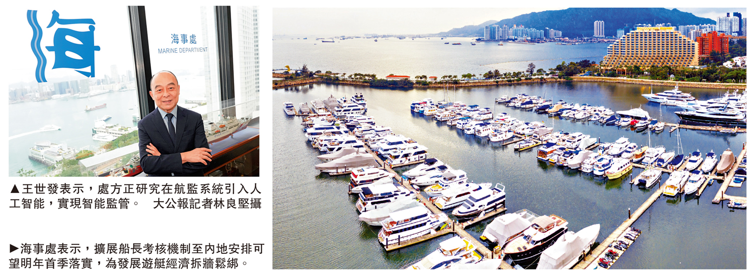 王世發首次透露,海事處正研究在航監系統引入人工智能,實現智能監管;並預告擴展船長考核機制至內地安排,可望明年首季落實,為發展遊艇經濟拆牆鬆綁。\大公報記者 曾敏捷、肖泓宇