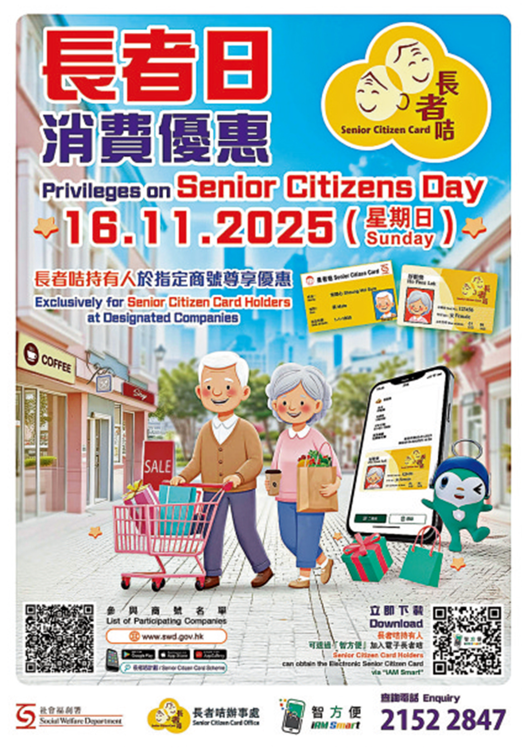為向長者表達敬意和關懷,社署籌辦「長者日消費優惠」活動,邀請本地飲食業、零售業及其他商戶於當日為長者咭持有人提供特別折扣或優惠。長者當日以手機掃描參與店舖的海報上的二維碼,即可瀏覽參與商戶名單和優惠資料。