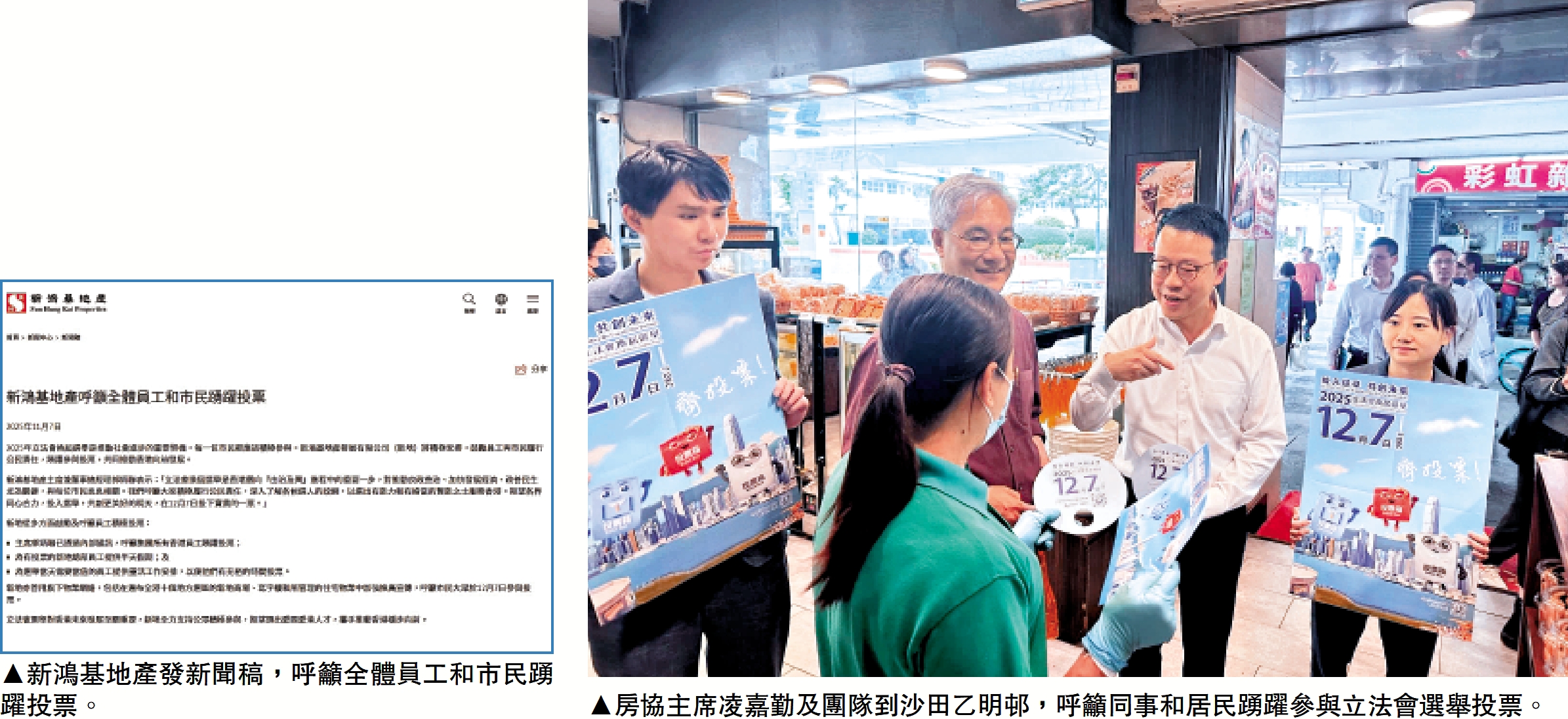新鴻基地產表示,主席郭炳聯已透過內部通訊呼籲集團所有香港員工踴躍投票,並為有投票的新地總部員工提供半日假期。同時為選舉當天需要當值的員工提供靈活工作安排,讓他們有充裕時間投票。新地亦運用旗下物業網絡,在遍布全港10個地方選區的新地商場、寫字樓及所管理的住宅物業中加強推廣宣傳,呼籲市民於12月7日參與投票。