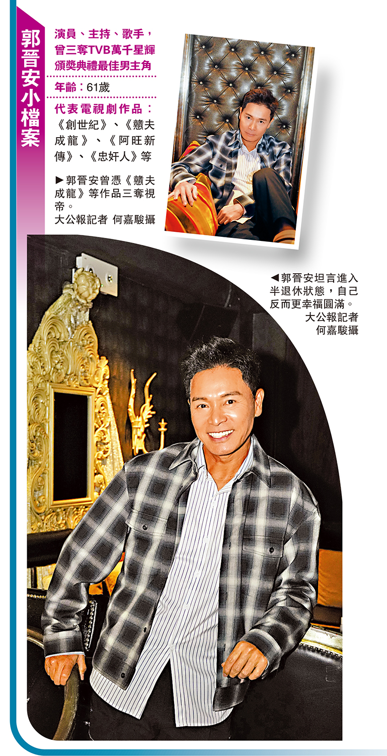 郭晉安(安仔)轉眼間加入演藝界四十年,過去他曾演出不少經典劇集,留下許多讓觀眾難忘的角色,亦曾三度獲封「視帝」,演藝事業上的成績表亮麗。而且在如今花甲之年,開展了人生另一事業,成為了上市公司非執行董事。惜感情路上並不順利,去年宣布與歐倩怡離婚,結束十八年的婚姻。但郭晉安坦言現在才是最圓滿幸福的,有充足時間跟子女相處,工作上亦可放慢腳步,選擇自己想做的事,至於再尋另一半,他並不抗拒,一切隨緣。\大公報記者 文霏霏
