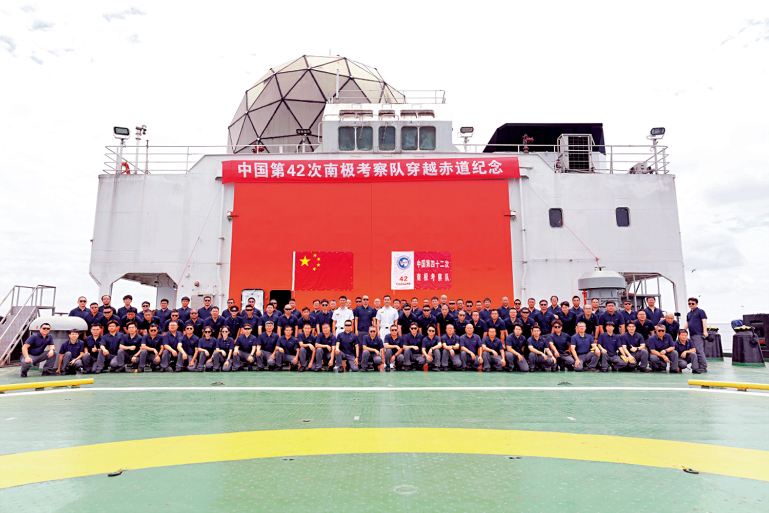 中國第42次南極考察隊在「雪龍」號上舉行了穿越赤道紀念活動。隊員們排列成「42」字樣的隊形合影留念,以簡單而熱烈的方式告別北半球,繼續向南極挺進。