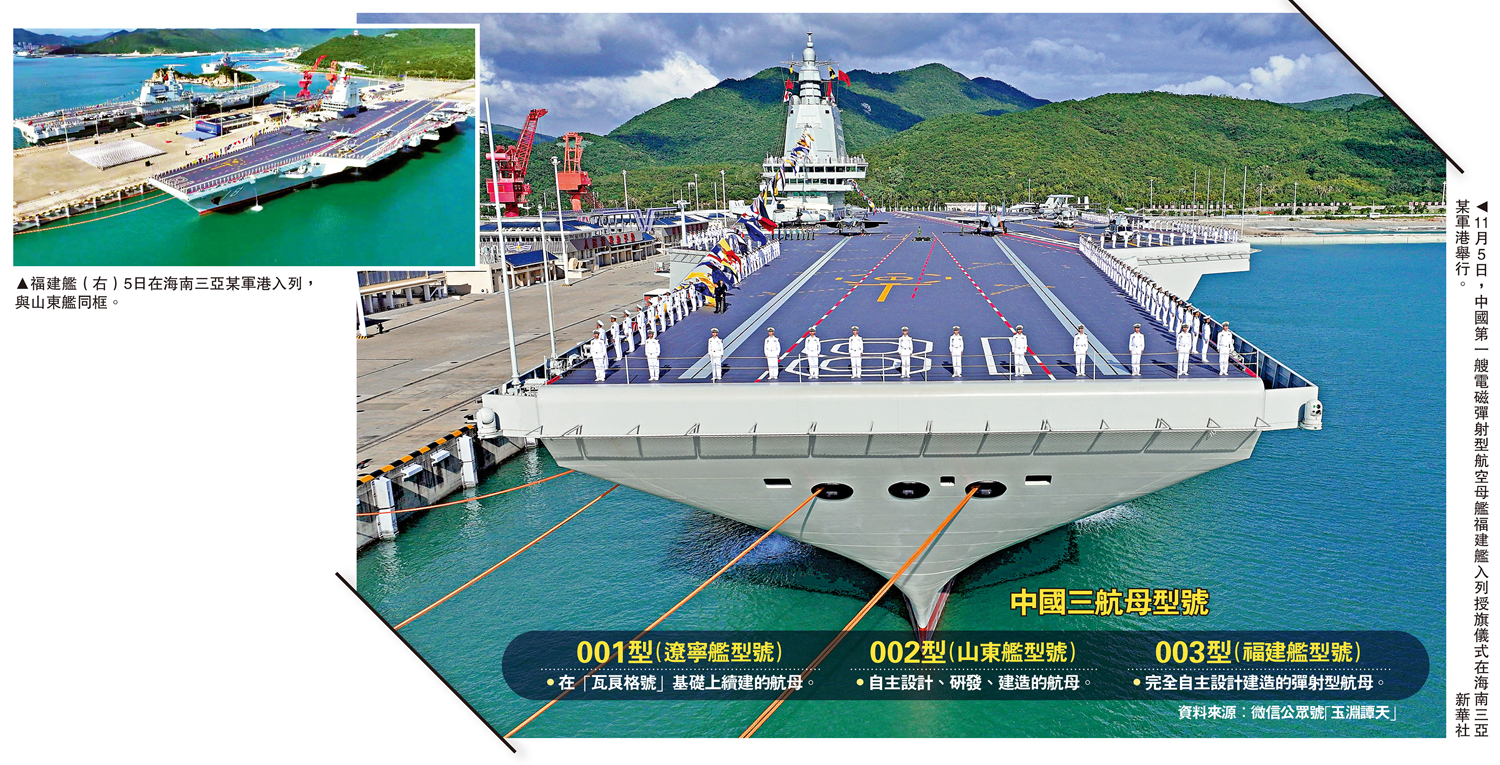11月5日,中國第一艘電磁彈射型航空母艦福建艦在海南三亞入列。海軍新聞發言人冷國偉8日下午接受記者書面採訪時表示,福建艦常駐地為三亞軍港,將以遠海大洋為家。