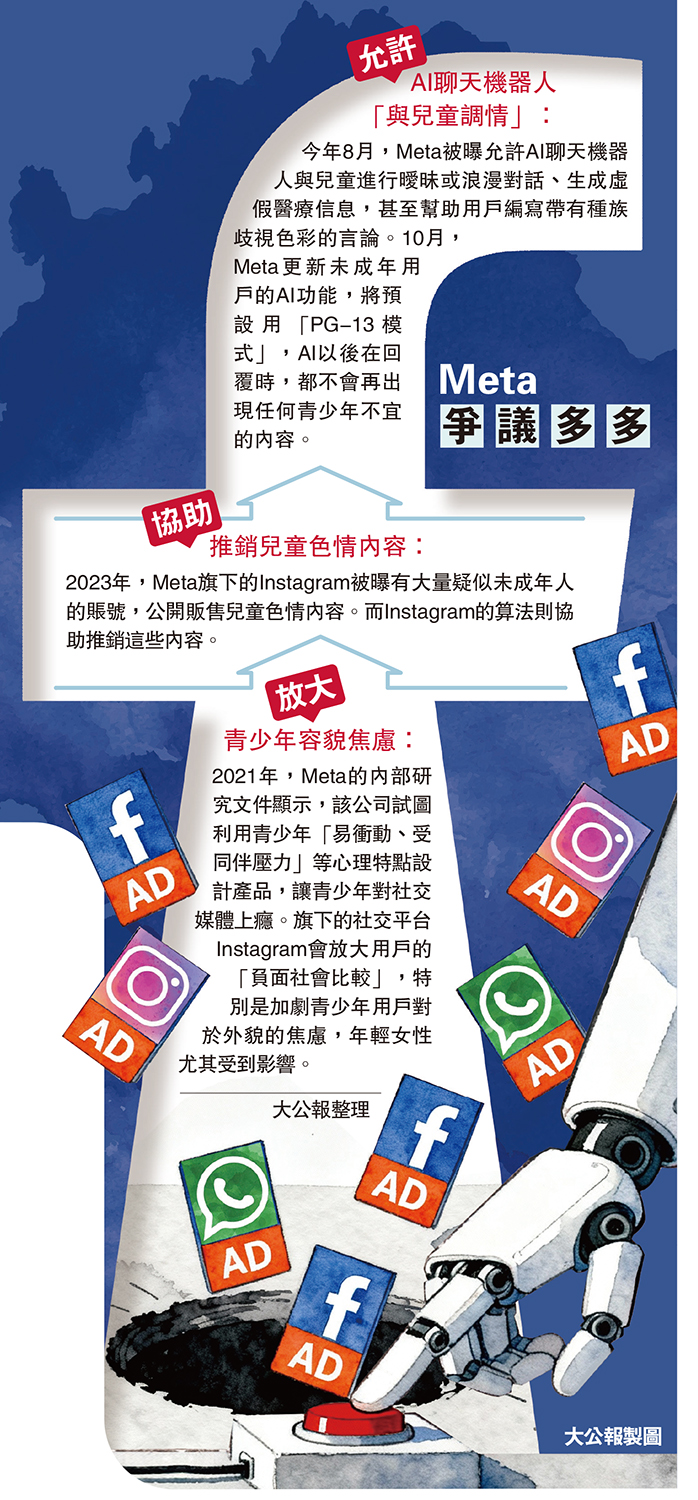 「與兒童調情」:今年8月,Meta被曝允許AI聊天機器人與兒童進行曖昧或浪漫對話、生成虛假醫療信息,甚至幫助用戶編寫帶有種族歧視色彩的言論。10月,Meta更新未成年用戶的AI功能,將預設用「PG-13模式」,AI以後在回覆時,都不會再出現任何青少年不宜的內容。