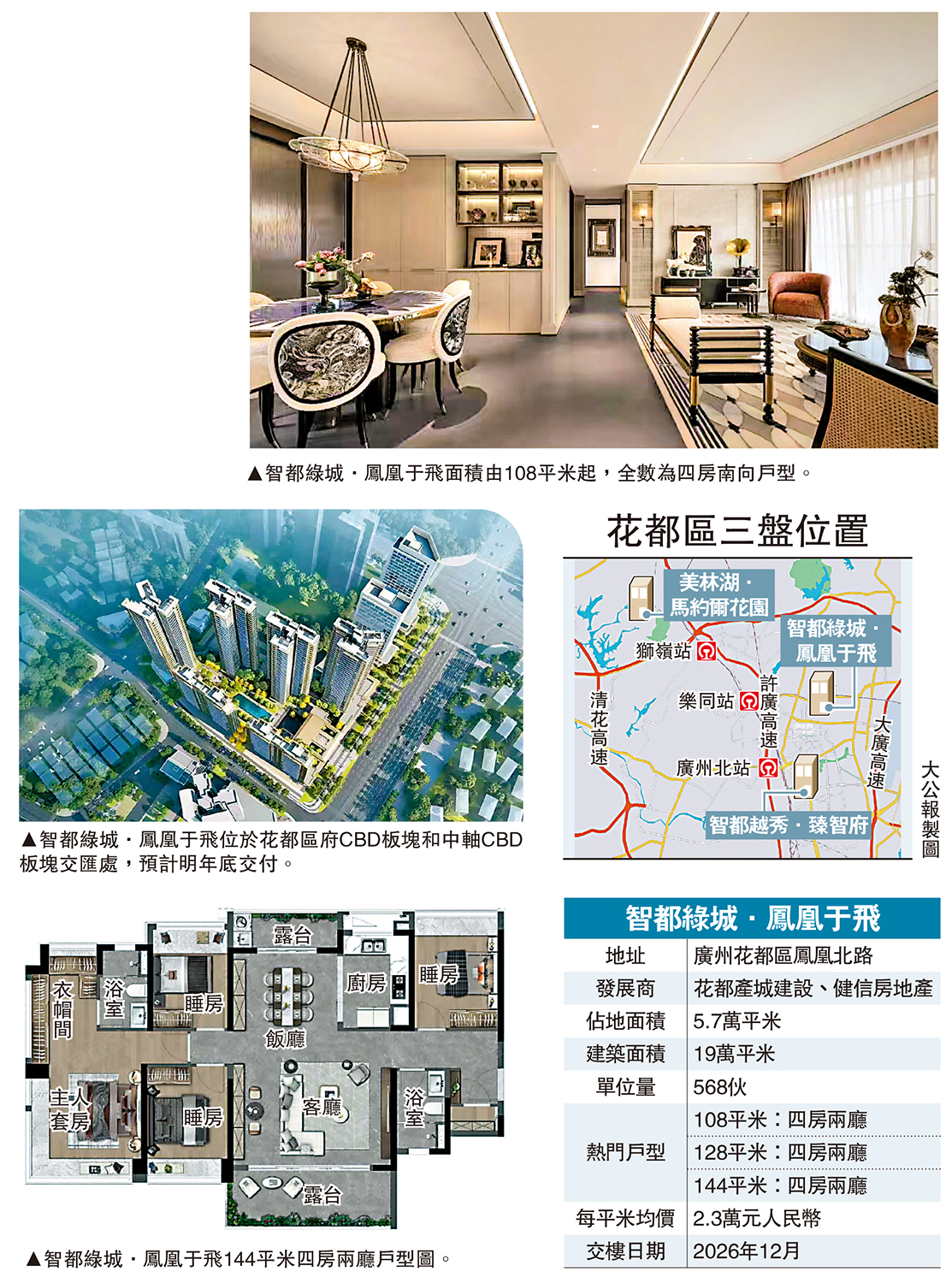 花都區府板塊近3年最大的住宅項目智都綠城·鳳凰于飛,定位為純改善住宅,主推單位面積介乎108至144平米,全部為四房戶型,每平米均價2.3萬元(人民幣,下同,約2.5萬港元)。\大公報記者 帥誠廣州報道