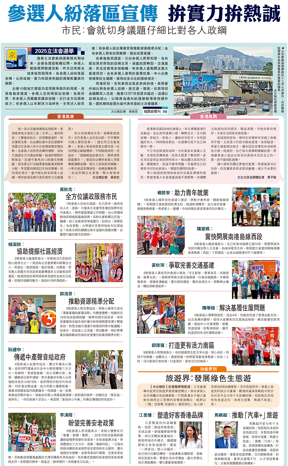 全港10個地方選區均呈現競爭激烈的局面。在香港島東選區,參選人在街頭設站宣傳,各展所長:有參選人憑藉豐富議政經驗,主打全方位服務能力;有參選人以年輕活力為特色,主張注入新思維;有參選人結合專業背景推動資源精準分配;也有參選人聚焦住房難題,提出政策建議。