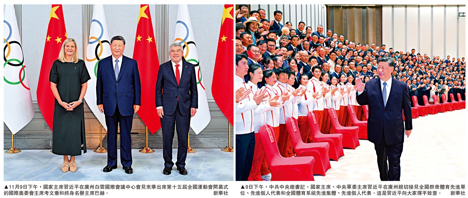 【大公報訊】據新華社報道:11月9日下午,國家主席習近平在廣州白雲國際會議中心會見來華出席第十五屆全國運動會開幕式的國際奧委會主席考文垂和終身名譽主席巴赫。